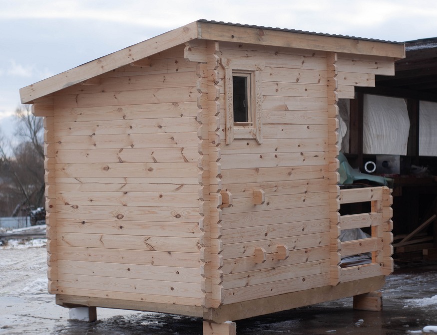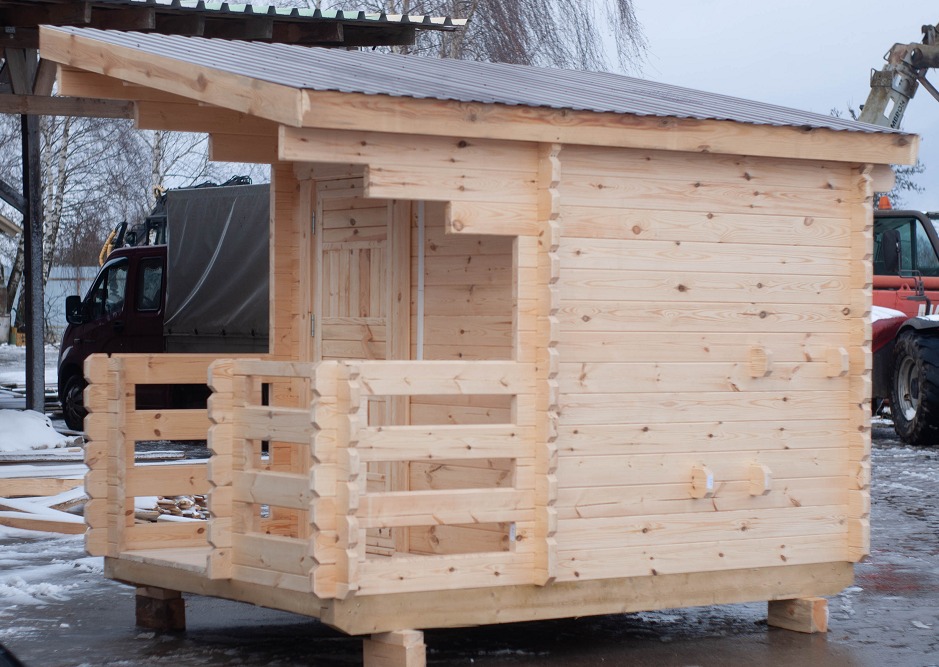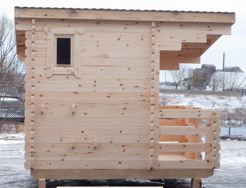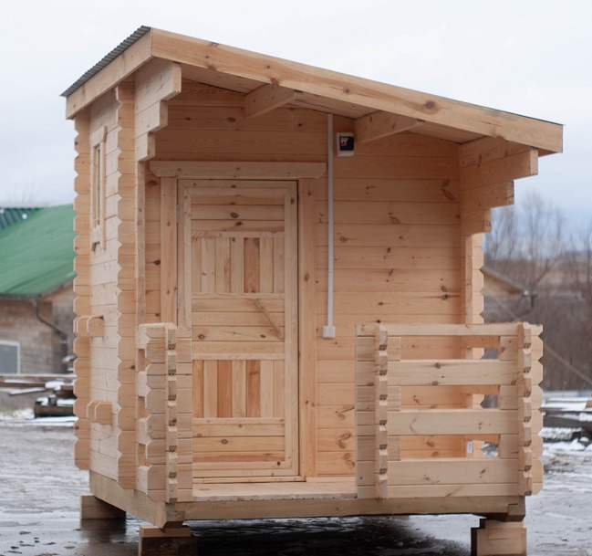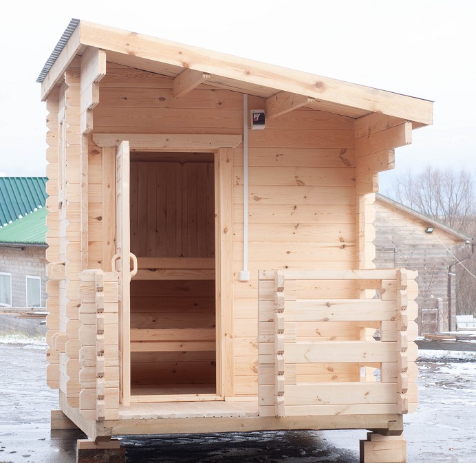 Баня изготавливается из профилированного бруса сечением 45 х 150 мм. Баня очень компактна, её размер всего 2,2 х 3,1 метра. Она идеально подходит для небольших дачных участков. Выполняется в двух вариантах – с открытой или с закрытой террасой.